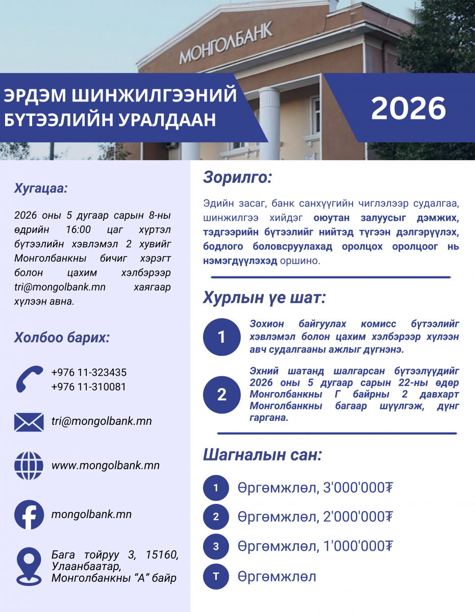 Уралдаанд ирүүлэх бүтээлүүдийг 2026.05.08-ны өдрийн 16:00 цаг хүртэл Монголбанкны бичиг хэрэгт цаасан хэлбэрээр болон tri@mongolbank.mn и-мэйл хаягт цахим хэлбэрээр хүлээн авах тул бүтээлээ ирүүлэхийг урьж байна.