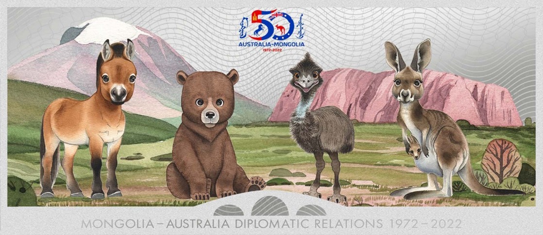 Монгол Улс Австралийн Холбооны Улстай 1972 оны есдүгээр сарын 15-ны өдөр албан ёсоор дипломат харилцаа тогтоосон бөгөөд 2022 онд дипломат харилцаа тогтоосны 50 жилийн ойг тохиолдуулан Монголбанкнаас санаачлан дурсгалын ялтсан мөнгөн дэвсгэртийг гаргаад байна.
